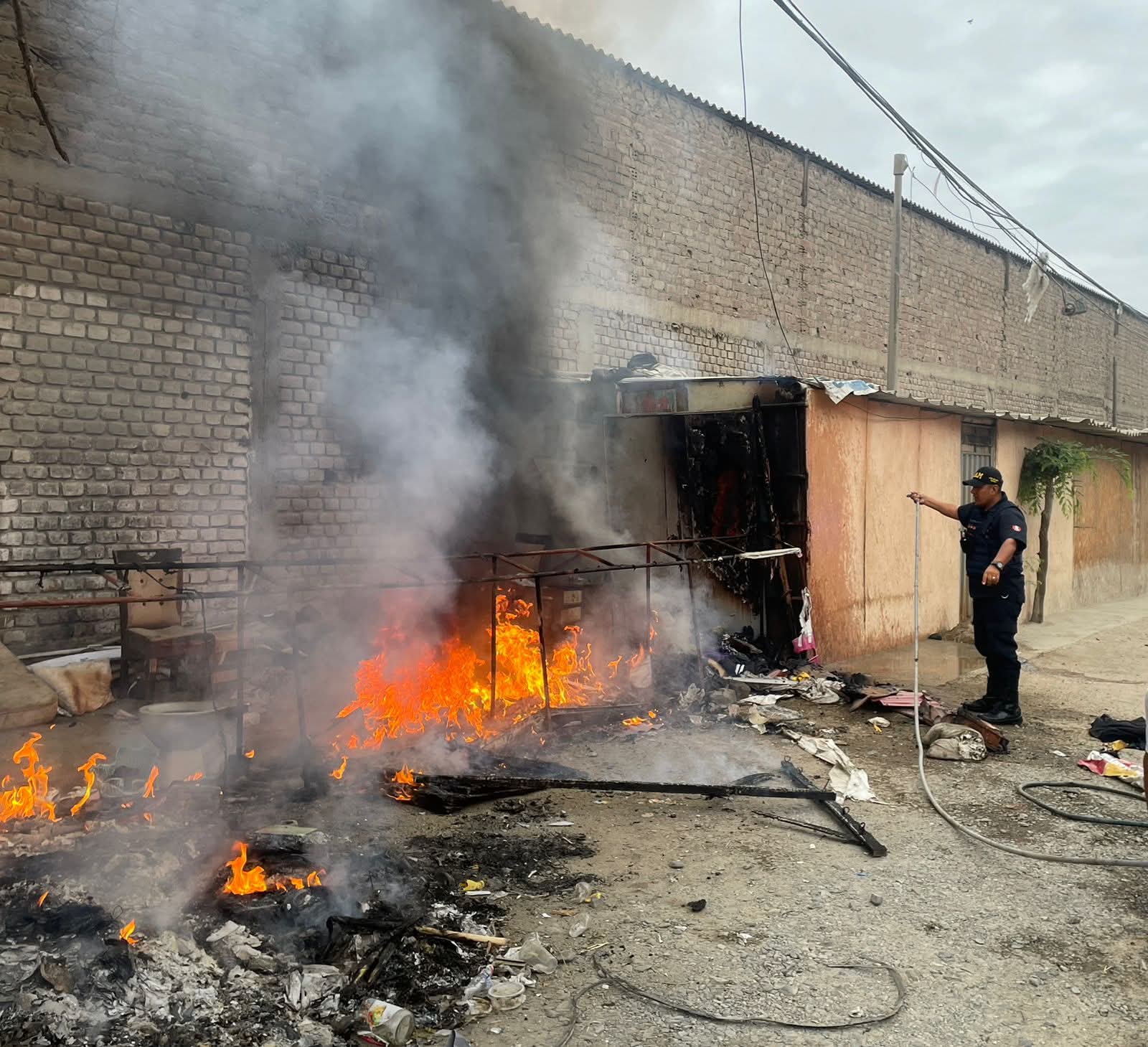 Un incendio que se originó en un módulo prefabricado y amenazaba con extenderse a varios inmuebles colindantes, fue controlado y sofocado gracias a la rápida y oportuna intervención de agentes del Grupo de Intervenciones Rápidas Municipales (IRAM) de la Municipalidad Provincial de Trujillo, evitando que